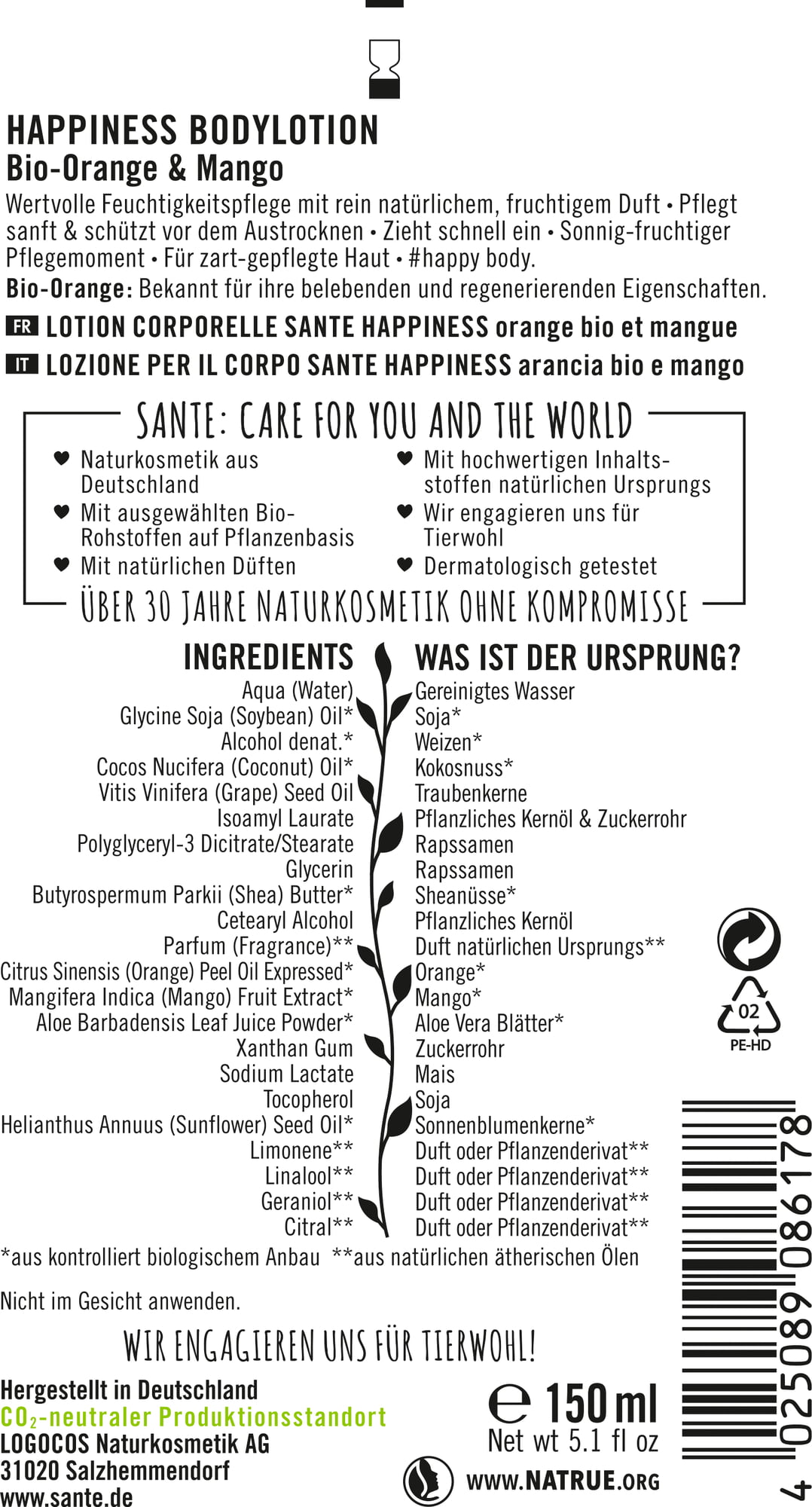 Awaken your skin & senses! The HAPPINESS Body Lotion by SANTE nourishes the skin in a natural way. lt is formulated with organic cupuaçu butter and organic jojoba oil that deliver moisture while organic orange and mango extracts delight the senses with their tropical scent.